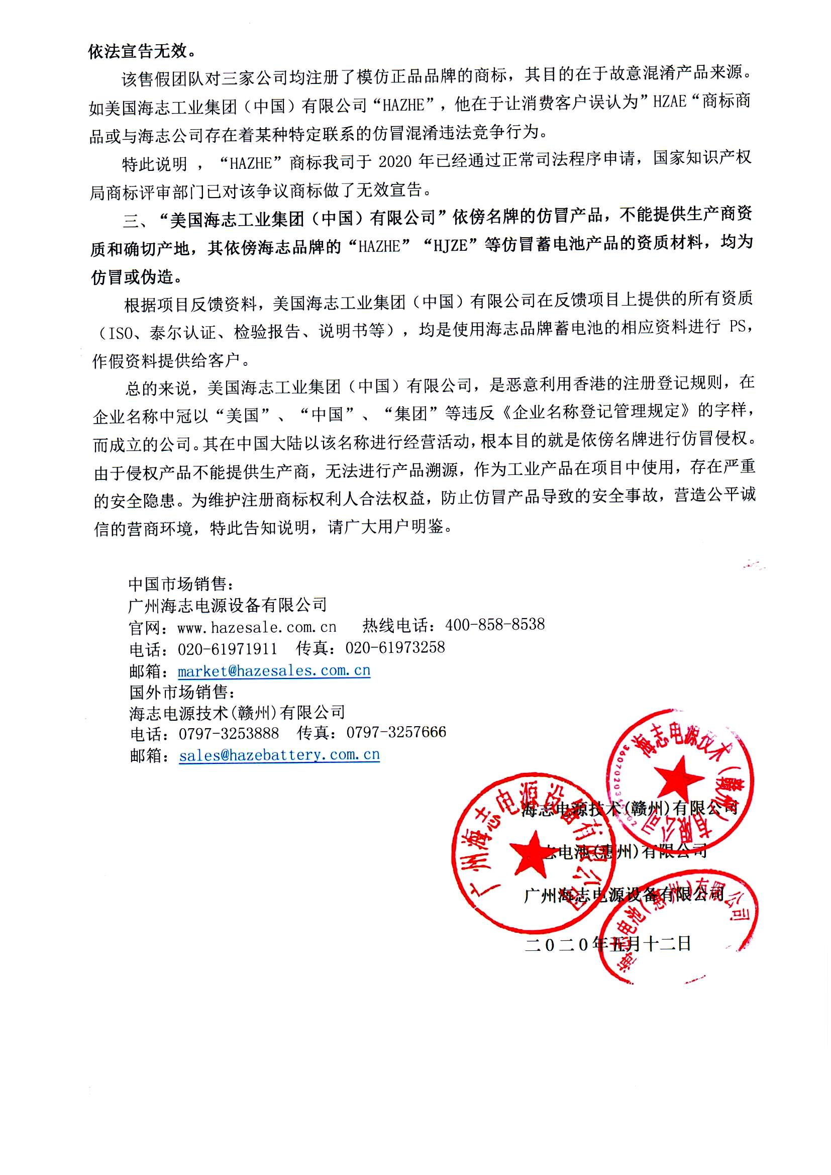 關(guān)于“美國海志工業(yè)集團(中國)有限公司擾亂海志市場的說明